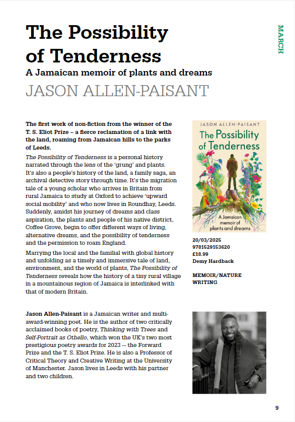 The Possibility of Tenderness is a personal history narrated through the lens of the ‘grung’ and plants. It’s also a people’s history of the land, a family saga, an archival detective story through time. It’s the migration tale of a young scholar who arrives in Britain from rural Jamaica to study at Oxford to achieve ‘upward social mobility’ and who now lives in Roundhay, Leeds. Suddenly, amidst his journey of dreams and class aspiration, the plants and people of his native district, Coffee Grove, begin to offer different ways of living, alternative dreams, and the possibility of tenderness and the permission to roam England.